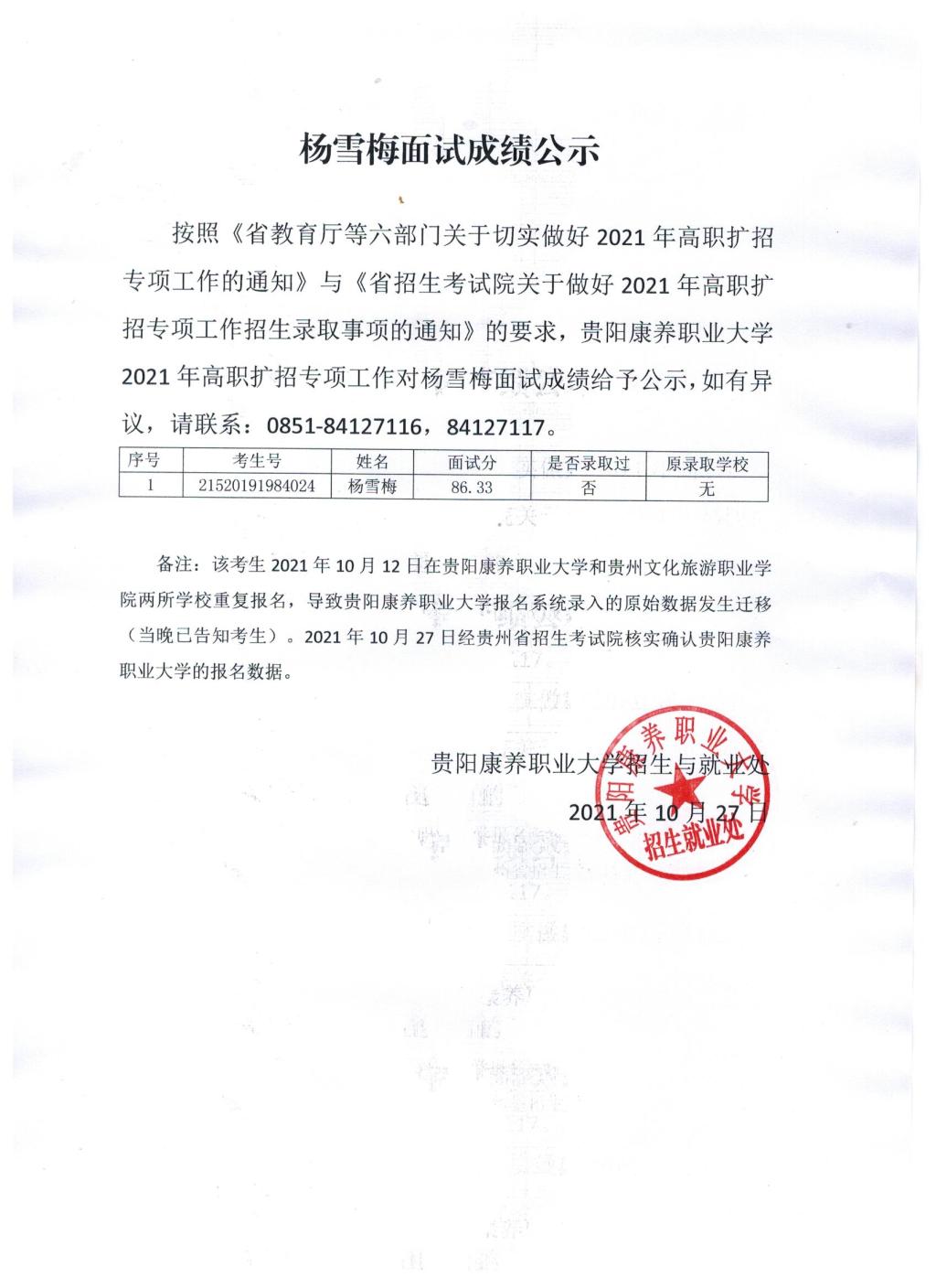 YABO鸭脖官网2021年高职扩招专项工作对杨雪梅面试成绩的公示
