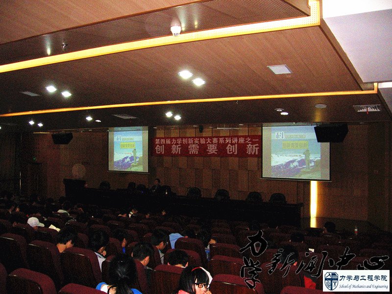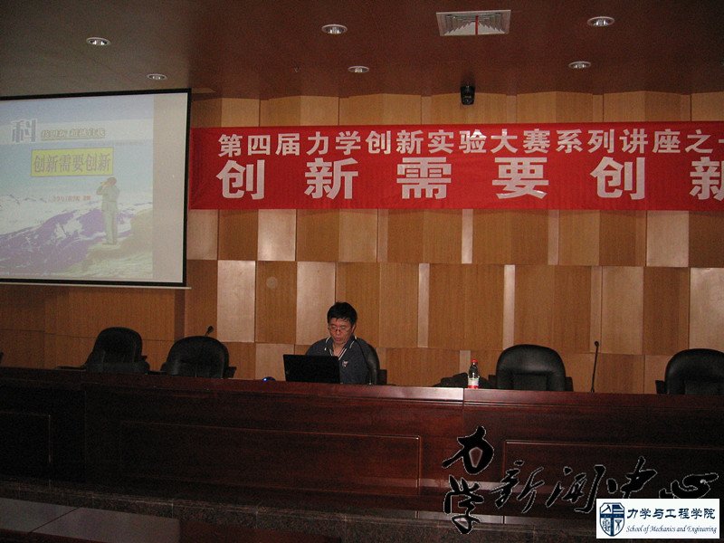 2012年4月19日下午两点整,在犀浦校区图书馆一号报告厅,由力学与工程学院承办的第四届力学实验竞赛及暨力学实验室开放周活动系列讲座拉开帷幕,此次讲座主讲人是力学学院龚晖教授,题目是“创新需要创新”,该项讲座同时也是学院学风建设系列活动之一,旨在开阔同学们的视野,培养正确良好的学风。力学学院全体辅导员和本科生在台下认真聆听报告.