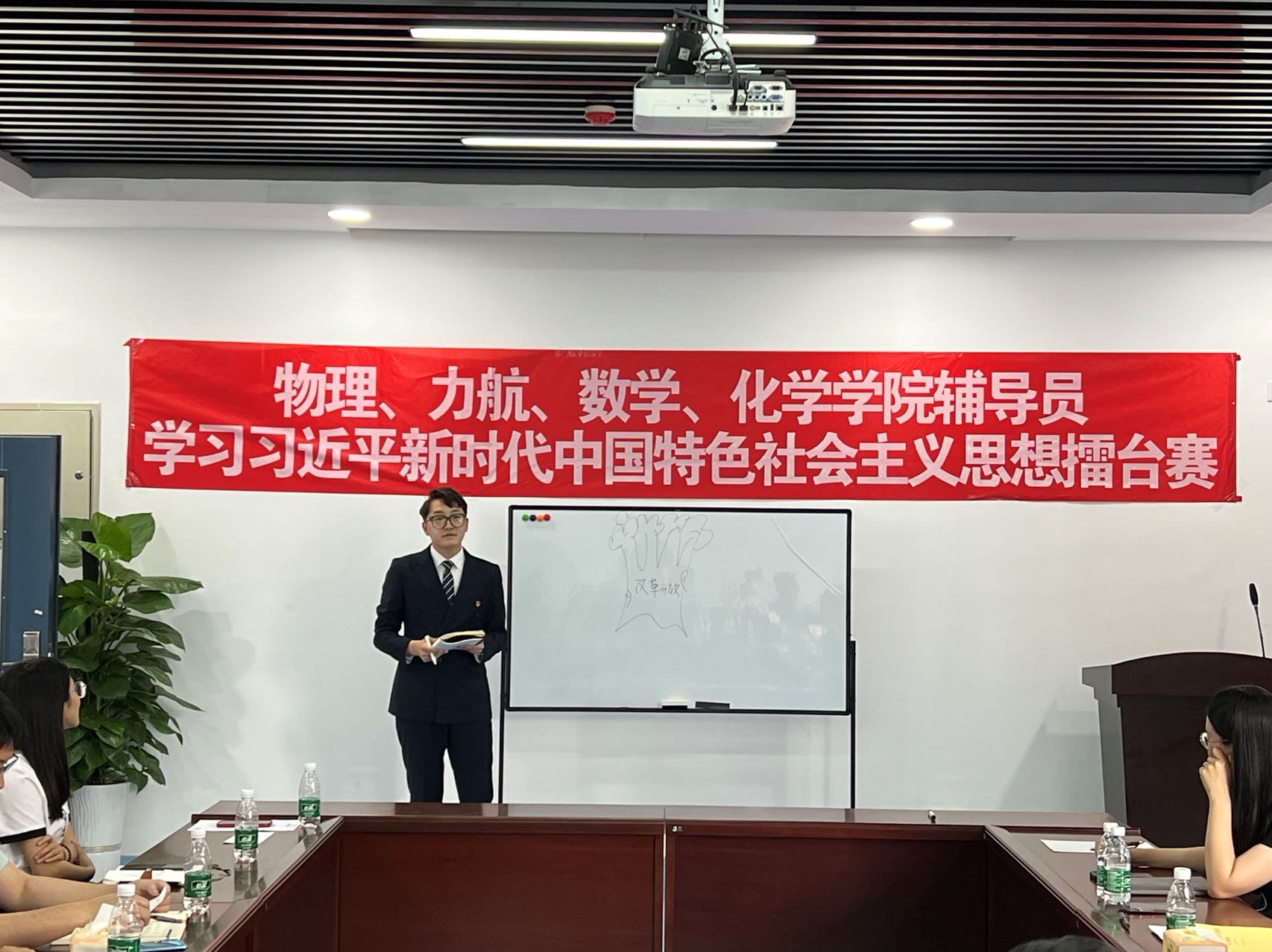 周老师以一棵高山榕的故事寓意改革开放40多年以来仍然焕发出生机活力,改革开放只有进行时,没有完成时。以数学人的视角,将实现中华民族伟大复兴喻为数学建模中的最优化问题,而改革开放是作为这道优化问题的关键变量、也是关键一招,一方面要刀刃向内、不断调整参数,另一方面要大门敞开,扩大这道优化问题的边界,同时利用好动态规划这一模型,不断推进新时代全面深化改革开放行稳致远。最后结合自身工作,新时代辅导员要大力弘扬伟大改革开放精神,在服务学生成长成才之路上奋力搏击。