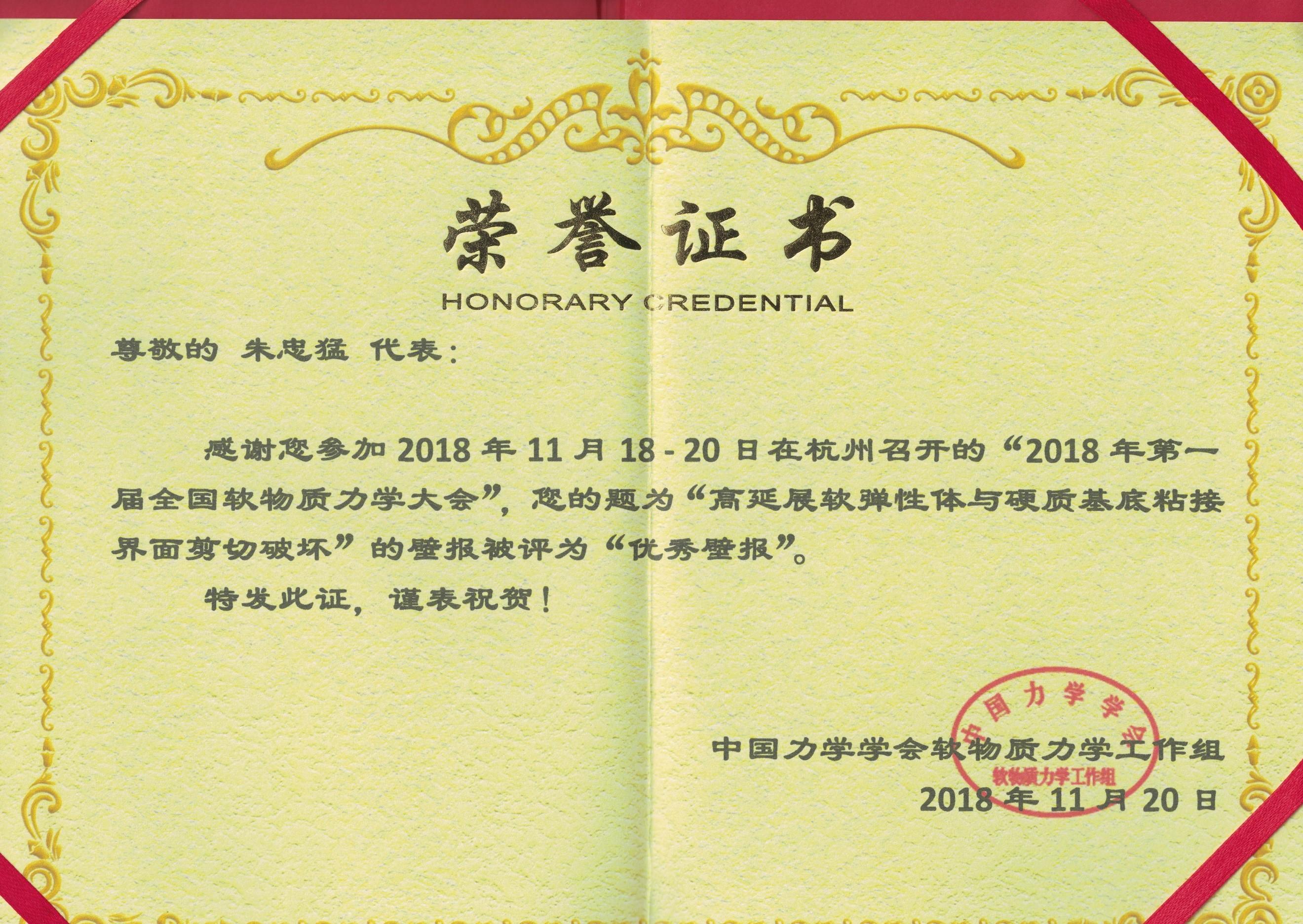 第一届全国软物质力学大会“优秀壁报”奖获奖证书