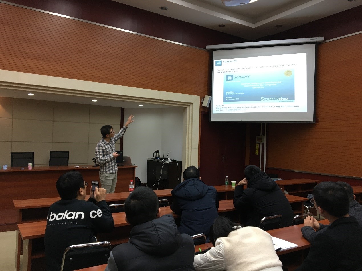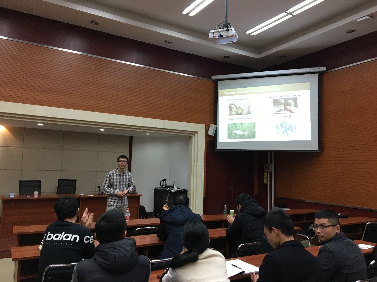 应万象城官网袁江宏副教授的邀请,2018年12月19日下午,美国宾夕法尼亚州立大学程寰宇博士来万象城官网进行学术交流,并作了题为“Dissolvable Tattoo Electronics for Biomedicine”的学术报告。程博士首先综述了柔性电子相关的前沿研究,包括先进转印技术、生物复合材料设计、多级微结构设计、三维组装等;接着重点介绍了可降解柔性电子的概念以及他近年来在可降解柔性电子方面的创新研究成果,包括可降解电子器件的力学设计及结构优化、可降解生物医疗传感技术、可降解集成电子等;最后对柔性电子尤其是可降解电子在人体健康监测及医疗等方面的潜在应用进行了展望。该报告引起了万象城官网师生的浓厚兴趣,现场气氛活跃、讨论热烈。报告结束后,万象城官网袁江宏老师与程寰宇博士就软材料与柔性结构设计等前沿课题进行了深入交流,并探讨了今后合作研究的可能性。程寰宇博士此行增进了万象城娱乐awc线路与国外知名高校之间的学术交流与合作,促进了万象城官网的科研发展。
