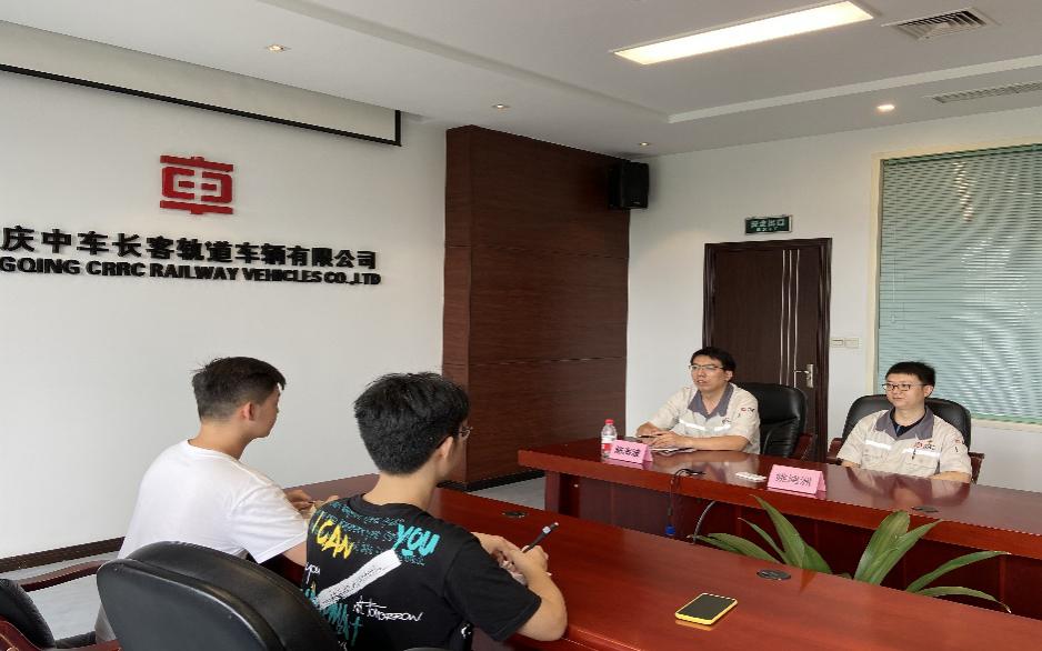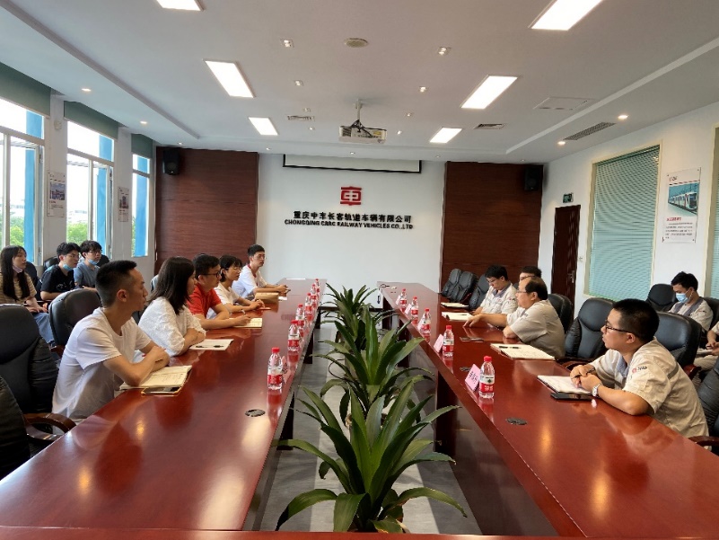 7月13日上午,实践队来到位于重庆市两江新区鱼复工业园区的重庆中车长客开展座谈、参观活动。座谈会中,重庆中车长客总经理马国华对实践队的到来表示热烈欢迎,并为实践队详细介绍了公司概况、发展战略、岗位需求等情况。参与座谈会还有重庆中车长客党委委员、生产总监王争(西南交大2004级校友),技术部党支部书记、副部长姚鸿洲(党的十九大代表、西南交大2004级校友),质量保证部部长陈海波(西南交大2004级校友),人力资源部部长李高升等。