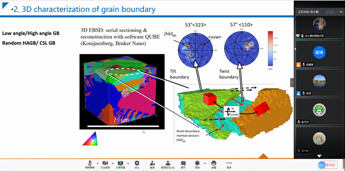 此次学术讲座,安大勇副教授报道了Fe-17Mn-1.5Al-0.3C (wt.%)在低周疲劳下的微观组织演变过程以及利用原位ECCI(In-situ ECCI)技术和高分辨EBSD(HR-EBSD)技术研究不同加载参数以及氢对疲劳组织和疲劳性能的影响。安大勇副教授通过实验发现,高锰钢的疲劳形貌展现出典型的平面滑移的特征,及均匀的密集的滑移系开动。传统理论认为只有交滑移的开动的前提下,疲劳组织才能形成复杂的位错组态,然而实验发现在高锰钢低周疲劳加载后,复杂的位错组织(如位错墙)同样可以形成。在此基础上,安大勇副教授指出,位错墙是由两组具有相同共线性位错交互作用形成,同时位错墙的内部也会形成了位错偶极子,大大屏蔽了位错墙的长程应力。最后安大勇副教授总结了EBSD和ECCI技术在材料微观组织演化和性能预测方面的应用前景,并期待后续与万象城官网能够开展更进一步的交流合作。