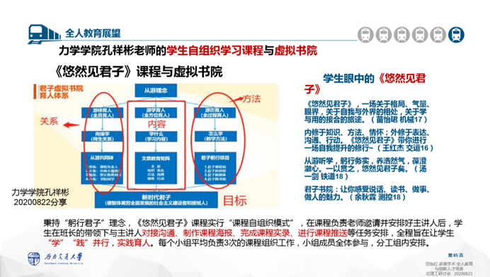 在国家级教学名师、南京大学桑新民教授主持的前置研修坊上,力学学院孔祥彬老师作为特邀嘉宾做了题为“君子虚拟书院的从游育人模式”的报告。君子虚拟书院是力学学院开展通识教育和课程思政的一个积极探索,它以通识课《悠然见君子》、新生研讨课《大学之道》、《大国动力》等课程为载体,将儒家从游育人方法与新时代“三全育人”理念融合,注重从知识、方法、情怀、表达、沟通、行动等“新君子六艺”来培养文质彬彬的新时代君子。与会老师们对这一教育探索表示出浓厚的兴趣,与孔祥彬老师进行了热烈的讨论。