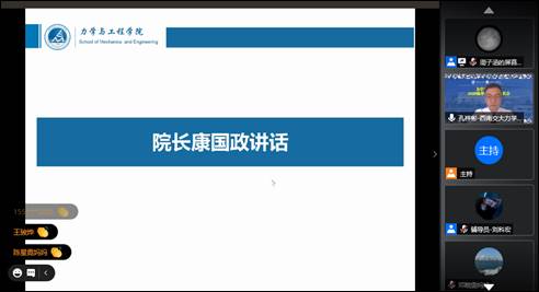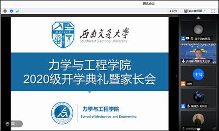 9月19日上午9:00,力学与工程学院在线召开了2020级开学典礼暨家长会。学院院长康国政、党委书记栗民等学院领导、教师代表、2020级新生辅导员以及2020级全体新生参加本次活动。会议由学院党委副书记孔祥彬主持。