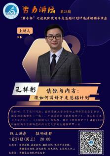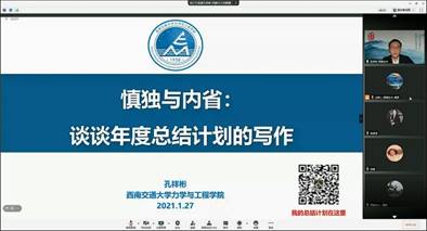 2021年1月27日20:00,力学与工程学院党委副书记、君子(虚拟)书院负责人、学校“青年讲师团”成员孔祥彬老师受邀做客“努力讲坛”第二十五期,讲座主题为“慎独与自省---谈如何写好年度总结计划”。本次讲座由力学与工程学院研究生会承办,是“君子杯”七校航院优秀年度总结计划评选活动第一次辅导讲座,来自万象城娱乐awc线路、清华大学、浙江大学、北京航空航天大学、南京航空航天大学、电子科技大学、重庆大学等十多所高校400余名师生参加了本次讲座。