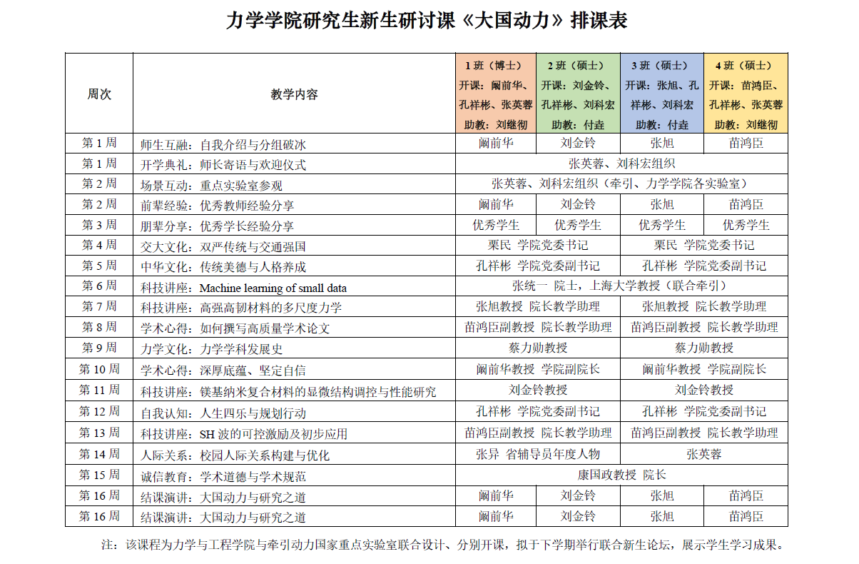 学期开始后,按照既定的教学大纲,力学与牵引的各位老师分工协作,顺利完成本学期授课。力学学院安排了4个班授课,其中研究生3个班、博士生1个班,由学院党委副书记孔祥彬老师担任课程负责人,阚前华教授、刘金铃教授、张旭教授、苗鸿臣副教授担任班主任,研究生辅导员张英蓉、刘科宏负责课程组织等具体工作。