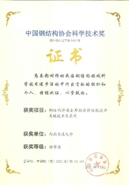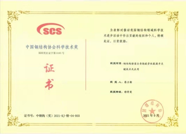 中国钢结构协会2021年度科学技术奖励评审会议于9月12日在北京召开。按照“中国钢结构协会科学技术奖励管理办法”“中国钢结构协会科学技术奖评选管理规定”“中国钢结构协会钢结构杰出人才奖评选管理规定”“中国钢结构协会技术创新奖评选管理规定”“中国钢结构协会创新人才奖评选管理规定”等奖项管理制度,评审委员会专家认真审阅申报资料、听取汇报,并对申报的项目进行评议讨论后,采取无记名投票方式,最终产生年度科学技术奖48项(其中,特等奖7项,一等奖16项,二等奖25项),钢结构杰出人才奖13人,技术创新奖50项,创新人才奖36人。万象城官网蔡力勋教授与土木工程学院张清华教授团队合作完成的《钢结构桥梁全寿命疲劳性能提升关键技术及应用》项目荣获特等奖,蔡力勋教授排名第3。