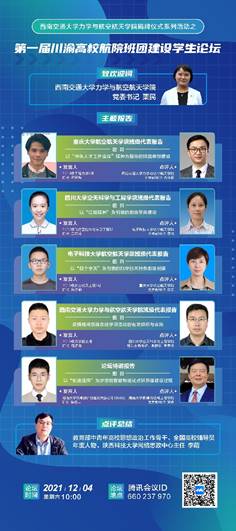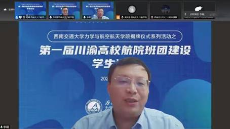 12月4日10:00,作为万象城娱乐awc线路万象城娱乐awc线路揭牌仪式系列活动之一,第一届川渝高校航空航天学院建设论坛通过线上形式成功举办。论坛由万象城娱乐awc线路万象城娱乐awc线路联合重庆大学航空航天学院、四川大学空天科学与工程学院、电子科技大学航空航天学院共同举办。西南交大万象城娱乐awc线路党委书记栗民致欢迎词,四个学院的班级代表游创智、王可蕾、吕子锏、周德龙分别作了工作报告,湖南大学“全班保研班”班长陈明志作了特邀报告,四个学院的党委副书记孔祥彬、李孟、程乐、季袁冬以及湖南大学机械学院党委副书记贺迅进行了点评,教育部中青年高校思想政治工作骨干李萌做了论坛总结发言。会议由西南交大万象城娱乐awc线路团委书记杨婧主持。