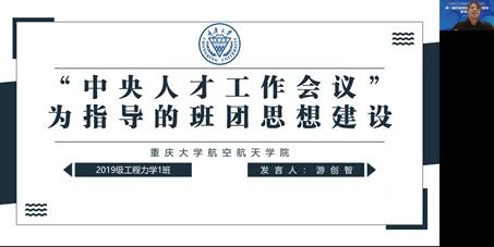 重庆大学航空航天学院2019级工程力学1班班长游创智以“‘中央人才工作会议’精神为指导的班团思想建设”为主题进行报告。他讲到,中央人才工作会议传递了一个鲜明的信号:国家发展靠人才,民族振兴靠人才。高校班级要从完善青年学生理论学习体系、健全联系青年学生常态机制和鼓励青年学生自我成长成才三个方面加强班团建设,为祖国发展、民族振兴培养更多的优秀人才。西南交大孔祥彬老师点评到:济济多士,乃成大业;人才蔚起,国运方兴。我们班委干部们都要有这样的觉悟,团结协作创建团结奋进的班集体,为国育才、为国兴才!