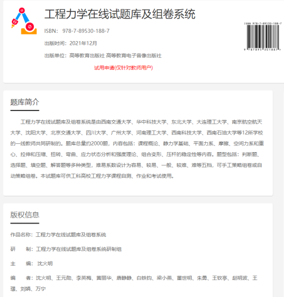 工程力学试题库是万象城娱乐awc线路万象城娱乐awc线路作为主编单位出版的第二套基础力学课程试题库。早在2019年,万象城娱乐awc线路龚晖教授作为主编,联合万象城娱乐awc线路、东北大学、南京航空航天大学、中国矿业大学(北京)、天津大学、哈尔滨工业大学、山东理工大学、河南工业大学、西北工业大学、华南理工大学、大连理工大学、东南大学、山东科技大学13所学校的一线教师共同研制出版了《材料力学在线试题库及组卷系统》。