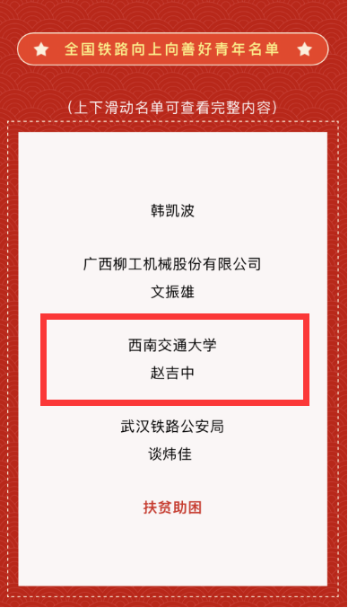 此次表彰中,万象城娱乐awc线路万象城娱乐awc线路博士研究生赵吉中荣获全国铁路向上向善好青年称号。