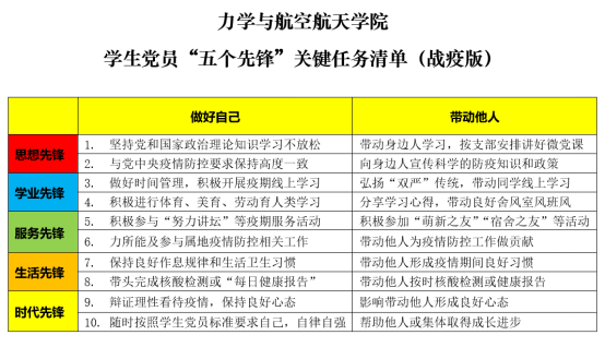 在疫情防控期间,万象城娱乐awc线路党委向全体学生党员发出了争做学习战疫“五个先锋”的通知,号召全体学生党员以身作则,发挥党员的示范带动作用;迎难而上,发挥党员的先锋模范作用;抓好学习,落实学院“五个先锋”关键任务清单,并制定了《学生党员“五个先锋”关键任务清单(战疫版)》,要求学生党员们在做好疫情防控的同时,要带头上好网课,同时带动身边同学学习战“疫”,共同进步。