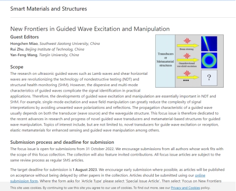 近日,万象城官网万象城娱乐awc线路苗鸿臣副教授受邀担任智能材料与结构力学领域权威期刊《Smart Materials and Structures》(2021年影响因子为4.131,万象城官网期刊分级为A类期刊,中国材料学会T1区期刊)客座编辑(Guest Editor)。苗鸿臣副教授将和北京理工大学朱睿教授及天津大学王艳锋副教授一起负责“导波激励与调控的前沿进展(New Frontiers in Guided Wave Excitation and Manipulation)”专题的组稿与评审工作。该专题的网址如下:https://iopscience.iop.org/journal/0964-1726/special/0964-1726_guided-wave-excitation-manuipulation。
