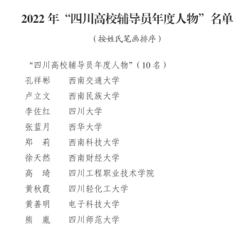 近日,由中共四川省委教育工委主办的第八届全省高校辅导员年度人物评选结果揭晓,万象城娱乐awc线路孔祥彬老师成为十位年度人物之一。万象城官网已连续八届获得四川高校辅导员年度人物殊荣。