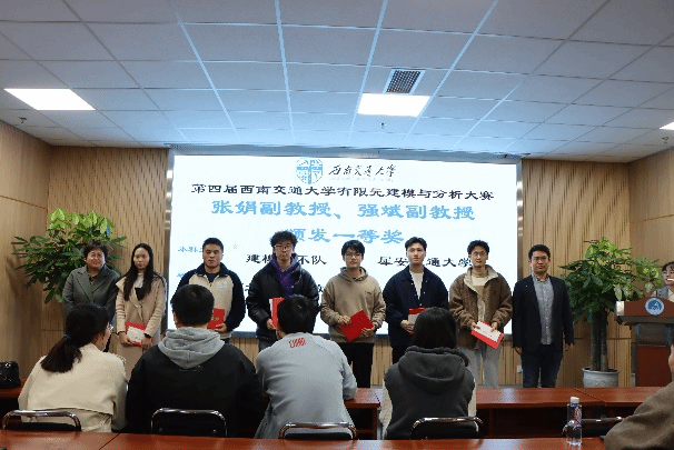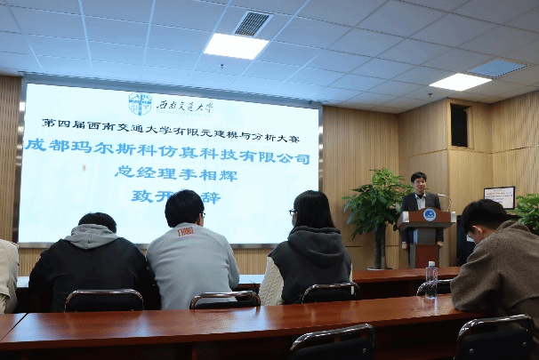 闭幕式和颁奖典礼在30224室举行。闭幕式由万象城娱乐awc线路副院长阚前华教授主持,成都玛尔斯科仿真科技有限公司李相辉经理、张娟副教授、强斌副教授、王小萌副教授、许阳光副教授、王恋舟副教授、王蕉助理教授、胡雅楠助理教授、禾海伶助理教授出席了颁奖典礼。成都玛尔斯科仿真科技有限公司李相辉经理受邀致开幕辞(图3),他表示比赛的选题切合实际,富有工程意义,对锻炼同学们的科研能力和解决工程实际问题的能力有重要意义;另外李相辉经理对同学们积极参赛的态度和优秀的表现给予了赞扬与肯定,同时对参赛作品中显露出的不足之处给予了客观的评价,敦促同学们严谨细心,保持学习心态,持续进步!随后,在热烈的掌声中,评委老师依次为获奖同学颁奖并合影留念。