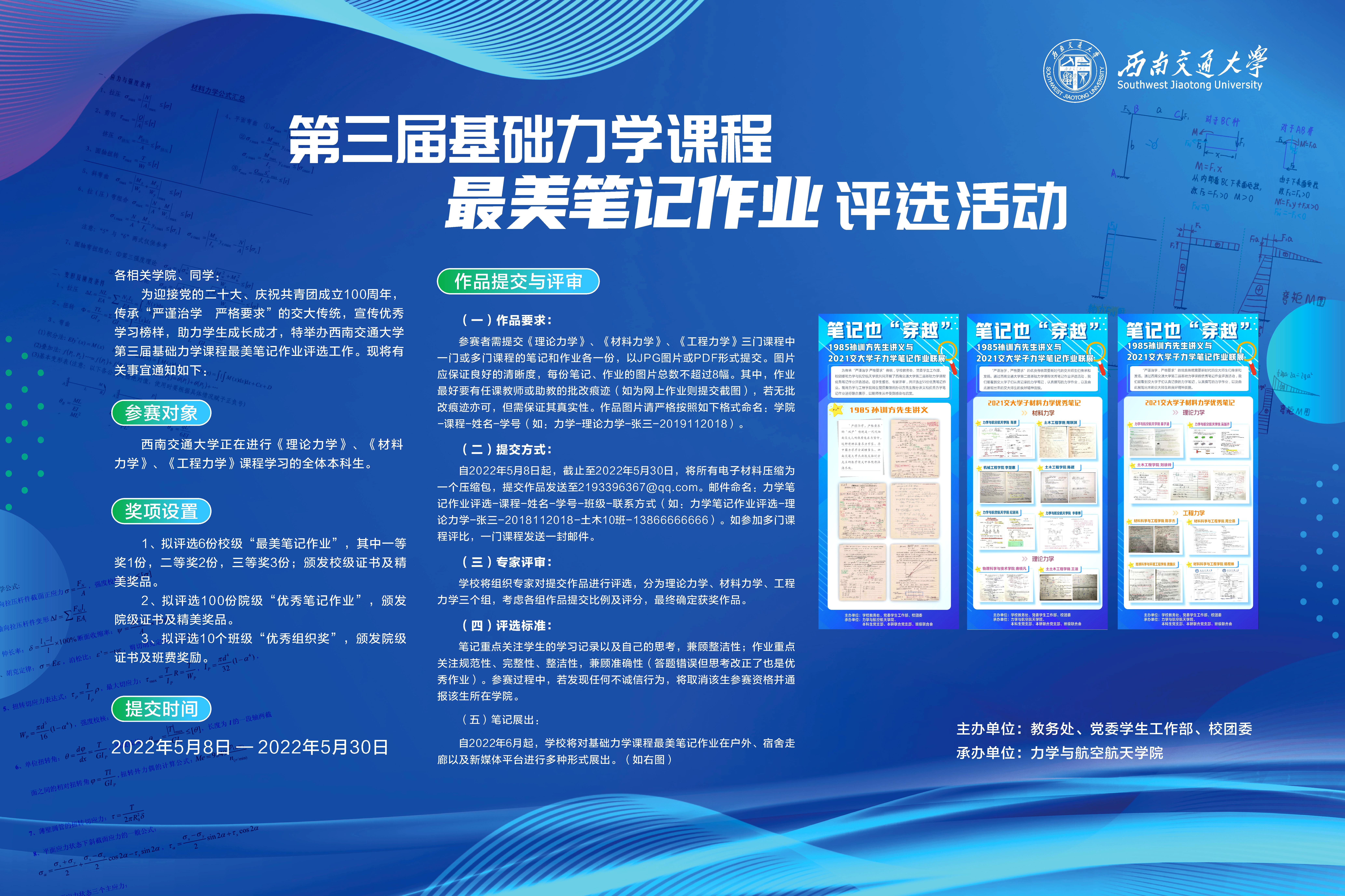 为迎接党的二十大、庆祝共青团成立100周年,传承“严谨治学严格要求”的交大传统,宣传优秀学习榜样,助力学生成长成才,特举办万象城娱乐awc线路第三届基础力学课程最美笔记作业评选工作。现将有关事宜通知如下: