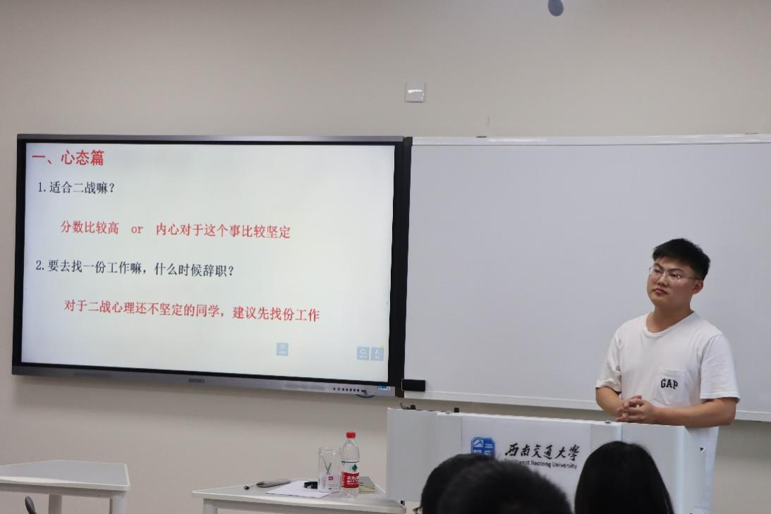 接下来,张剑同学也向同学们分享了自己对于“二战”的看法,从调整心态入手,向大家讲解了自己在“二战”期间的规划以及经验。