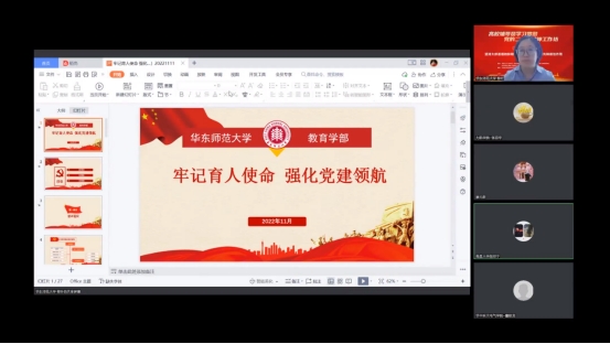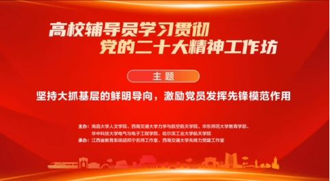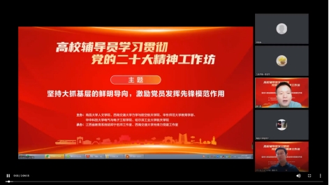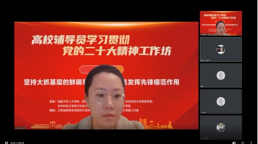 2022年11月13日,以“坚持大抓基层的鲜明导向,激励党员发挥先锋模范作用”为主题的第一期高校辅导员学习贯彻党的二十大精神工作坊通过腾讯会议在线上举办,全国有200多名辅导员在线参会。工作坊由万象城娱乐awc线路万象城娱乐awc线路、南昌大学人文学院、华东师范大学教育学院、华中科技大学电气与电子工程学院、哈尔滨工业大学航天学院联合主办,江西省教育系统胡邦宁工作室、万象城娱乐awc线路先锋力党建工作室承办。