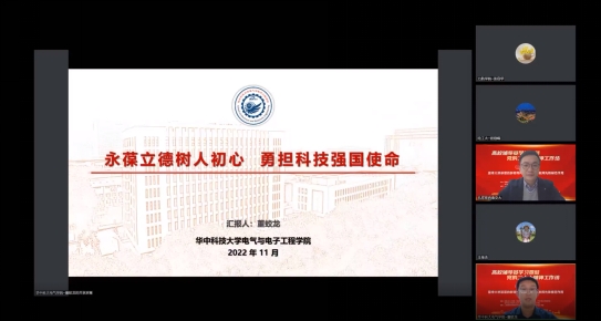 华中科技大学电气工程学院学生党建专项负责人董蛟龙以“永葆立德树人初心 勇担科技强国使命”为题进行了汇报,他介绍了学院实施“头雁领航”计划、“举旗定向”计划、“铸魂育人”计划、“强基固本”计划、“融创未来”计划“五项计划”的思路和做法。华东师范大学教育学部党委副书记沈晔进行了点评,她认为该院将党建工作和学科发展深度融合,从加强“五个到位”出发制定“五个计划”,实现党建工作高质量发展,使大家深受启发。