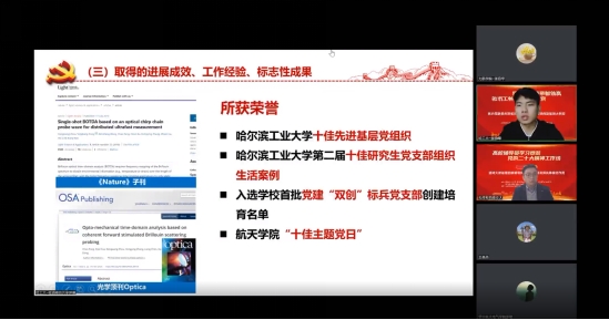 哈尔滨工业大学航天学院学生党建专项负责人程晓峰以“红色资源融入高校学生党建的探讨与实践”为主题,介绍了学院以卓越为目标、以问题为导向、以需求为牵引,将红色资源融入学生党建工作的具体实践。南昌大学人文学院党委副书记胡邦宁进行了点评,他认为哈尔滨工业大学航天学院做到了党建管理精细化、党建教育精准化、支部建设精品化,把红色资源融入基层党建有重要意义,值得在党建工作中细细挖掘。