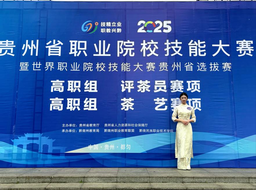 2025年4月23日至4月25日,由我院刘宇老师指导的康复治疗专业的学生林红如,在黔南职业技术学院参加了贵州省职业技能大赛高职组茶艺赛项,取得了省级三等奖的成绩,参赛学生优雅展示茶叶冲泡技艺,从温杯洁具到奉茶敬客,动作行云流水,诠释茶文化精髓。比赛弘扬工匠精神,推动茶艺传承与创新,助力茶产业人才培养。